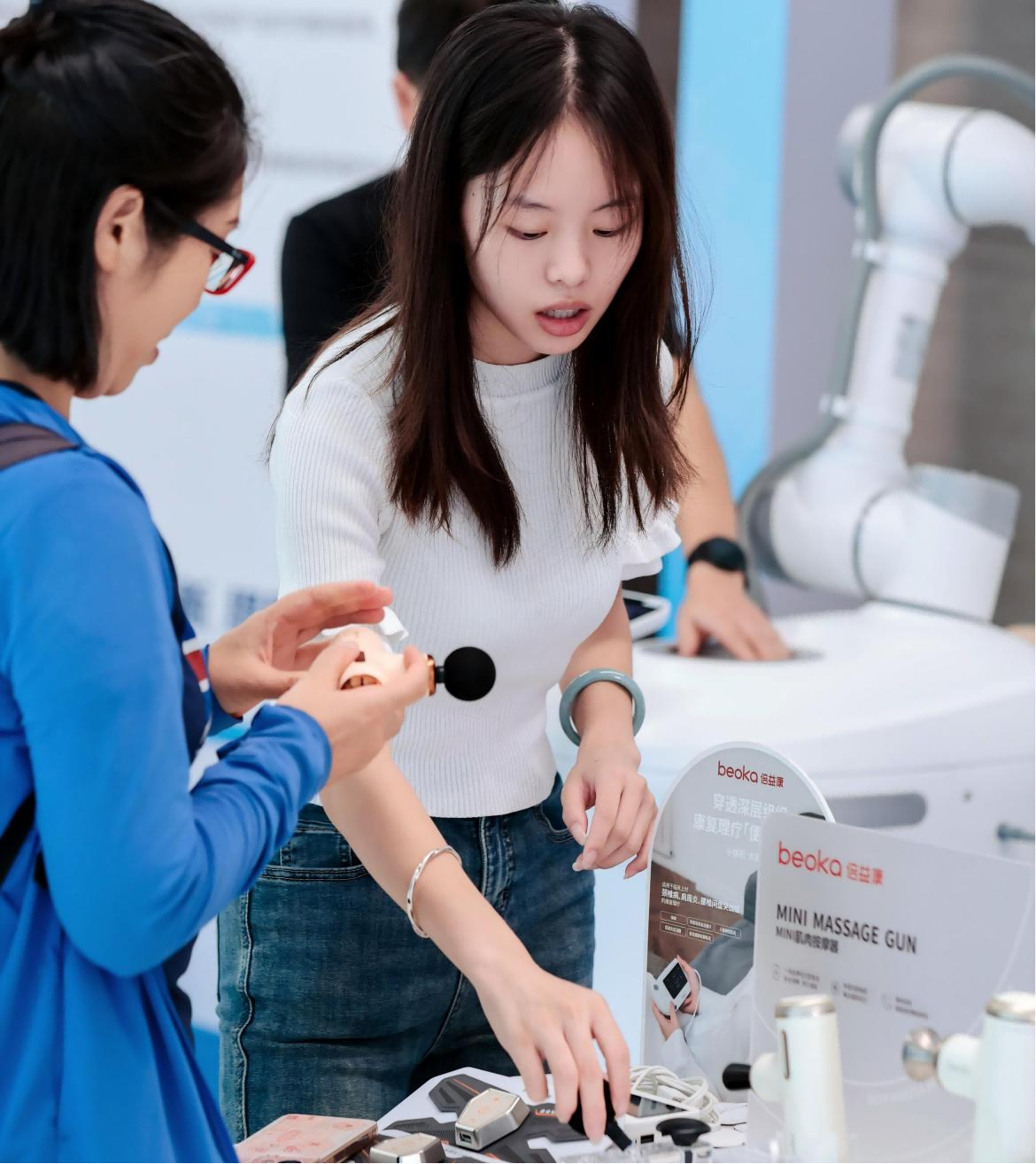作为一家集研发、生产、销售及服务于一体的智能康复理疗设备制造商,倍益康积极响应,携理疗机器人、筋膜枪、手持式中频电疗仪、肩颈按摩器等产品参与此次活动,通过现场展示与互动体验,让女职工直观感受理疗康复科技带来的舒适与放松。